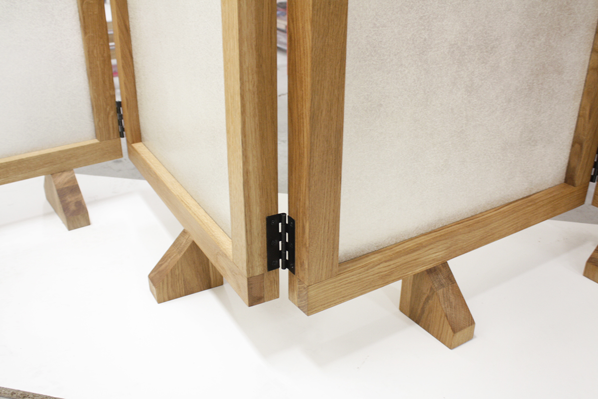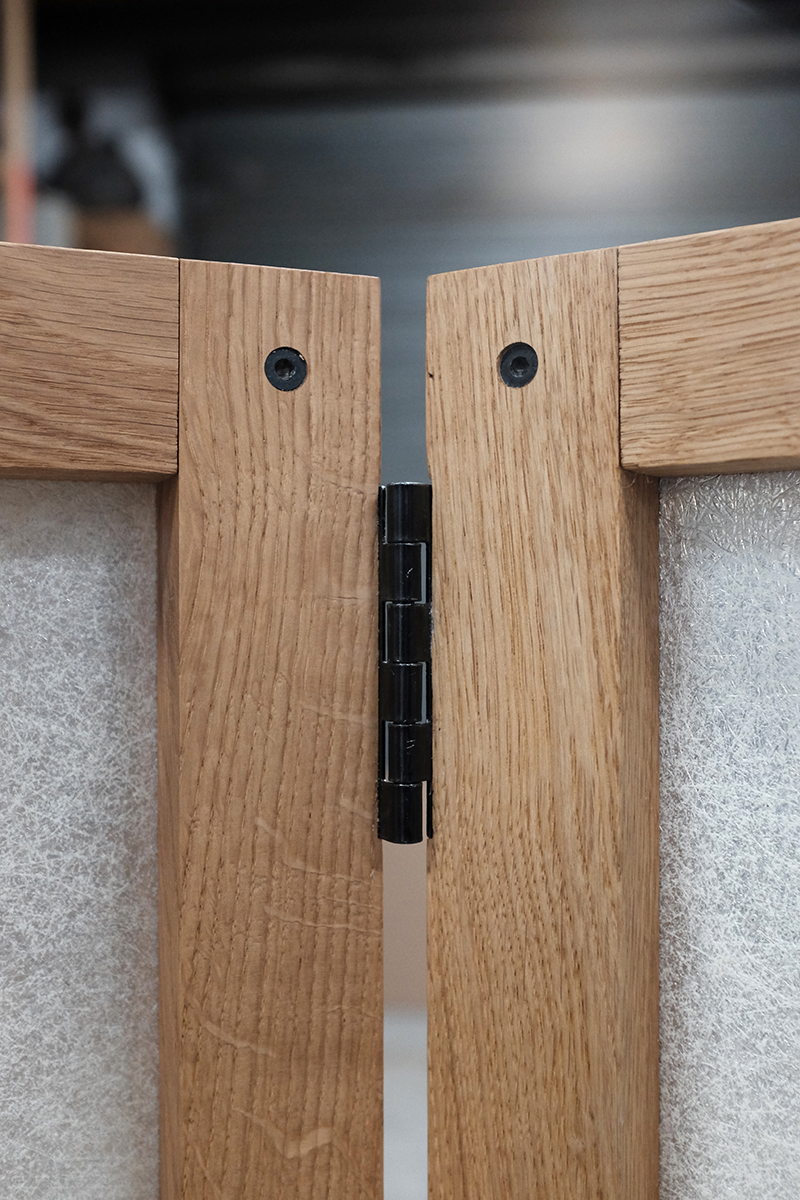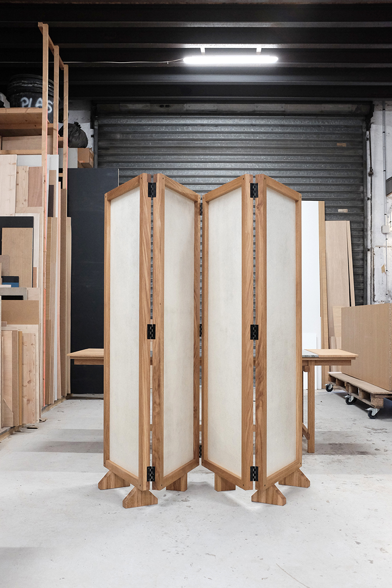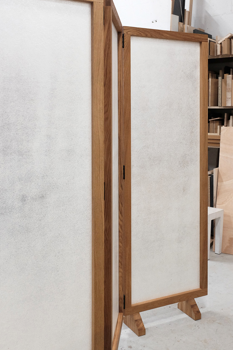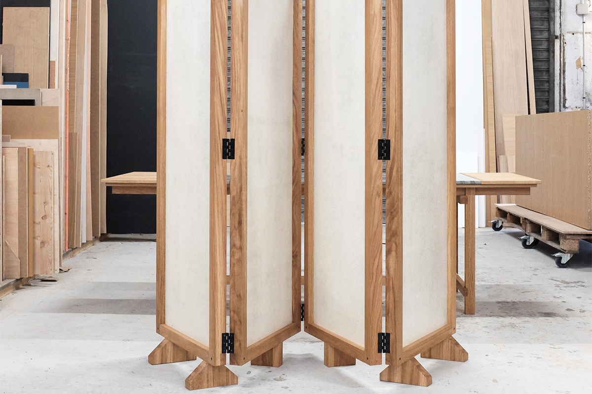Pour le paravent, nous avons fabriqué les panneaux en fibre de verre et résine polyester que nous avons ensuite intégré dans ces châssis en chêne massif. Une fois assemblés, les 4 châssis se déploient ou se compresse au gré des envies.