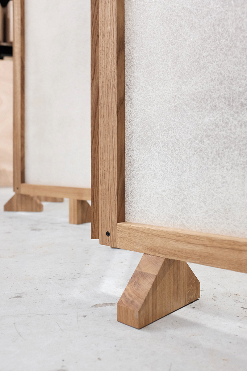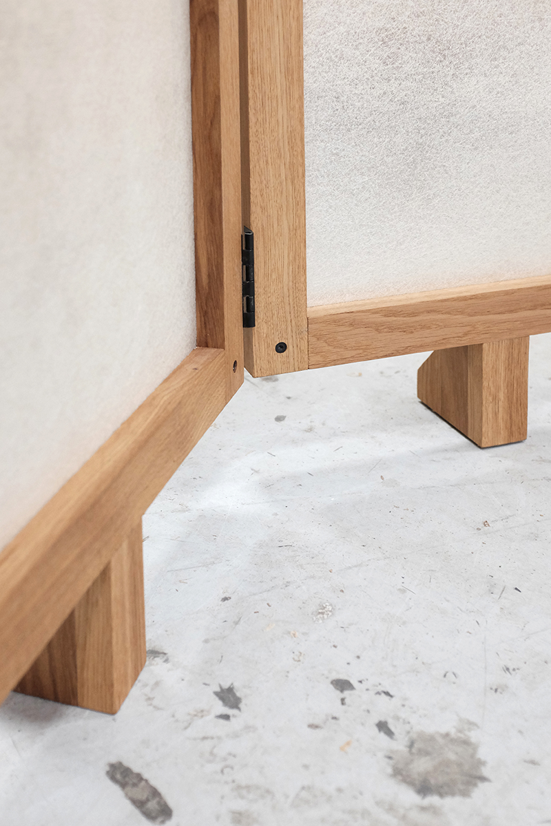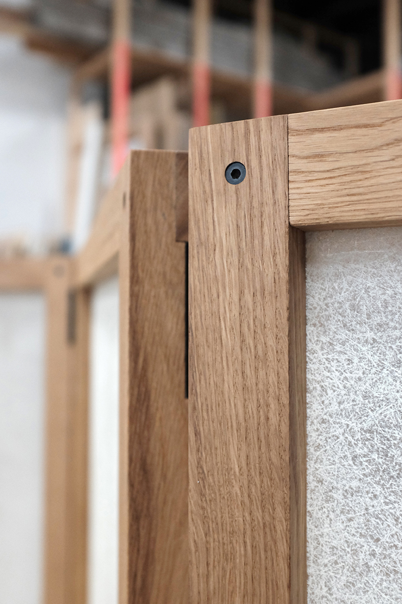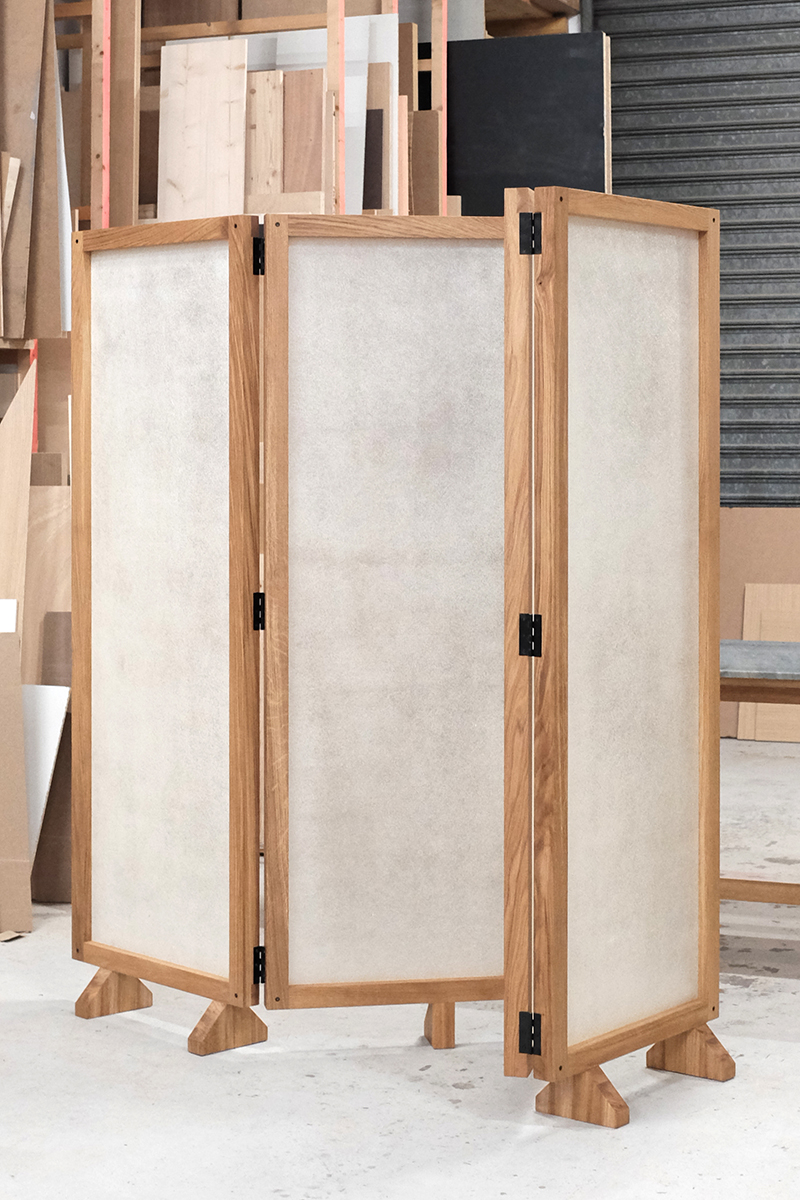Pour le paravent, nous avons fabriqué les panneaux en fibre de verre et résine polyester que nous avons ensuite intégré dans ces châssis en chêne massif. Une fois assemblés, les 4 châssis se déploient ou se compresse au gré des envies.