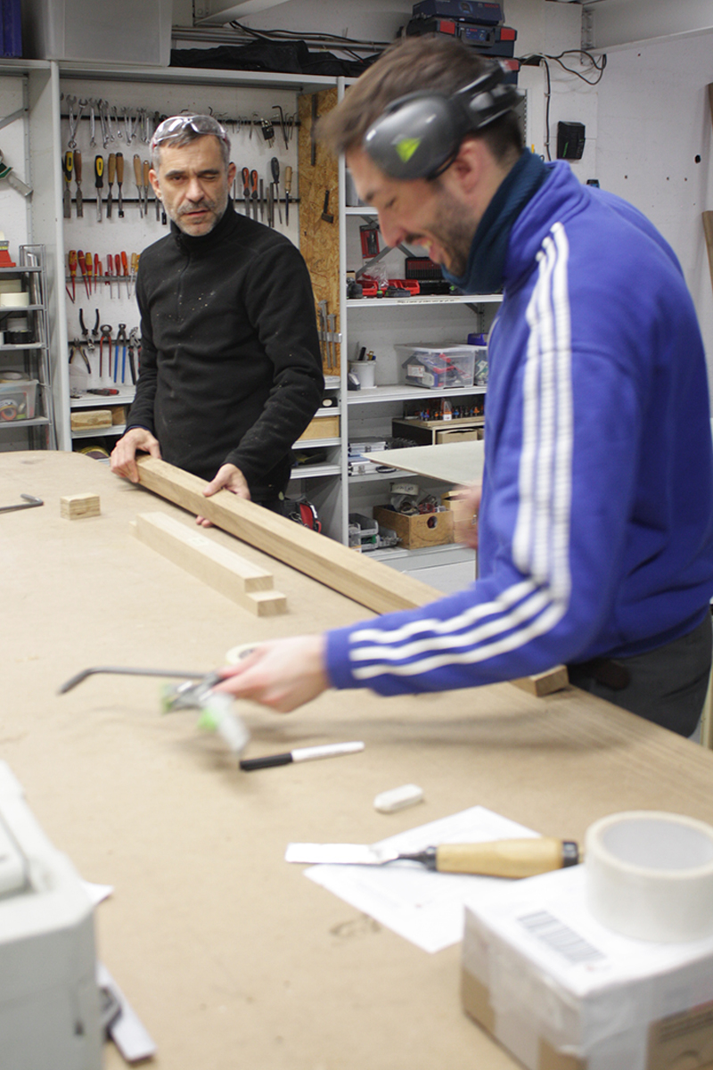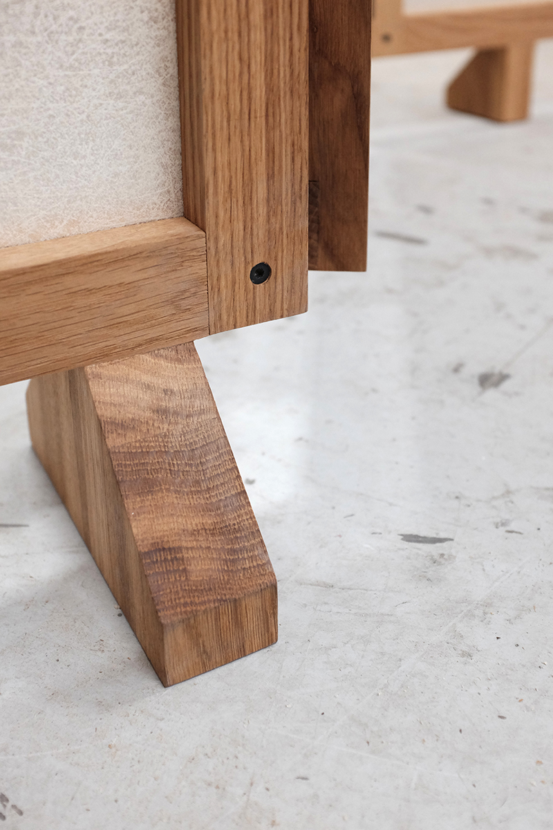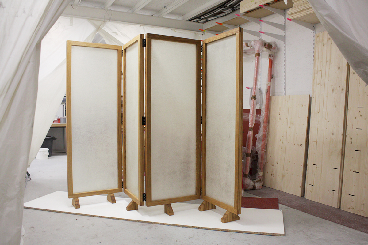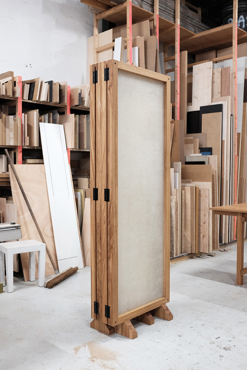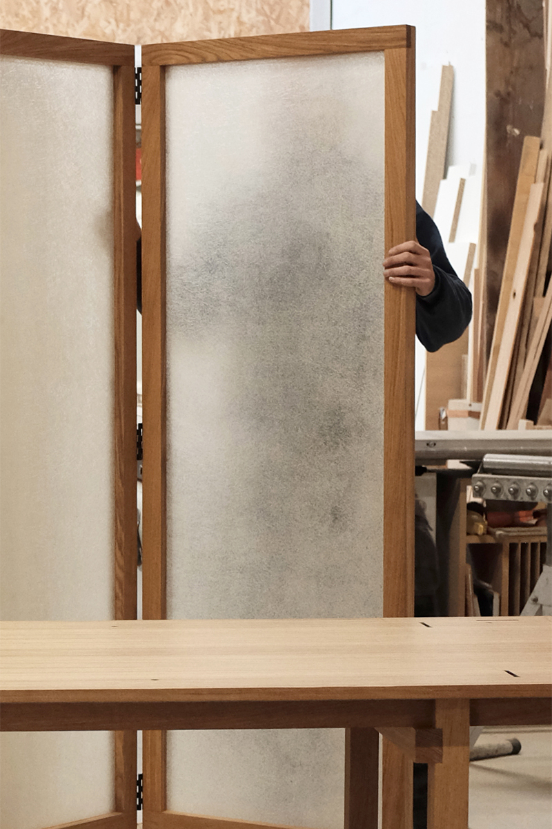 Pour le paravent, nous avons fabriqué les panneaux en fibre de verre et résine polyester que nous avons ensuite intégré dans ces châssis en chêne massif. Une fois assemblés, les 4 châssis se déploient ou se compresse au gré des envies.