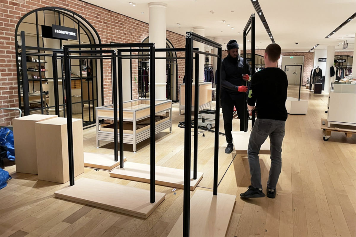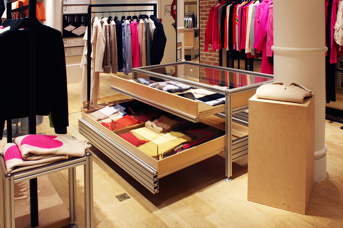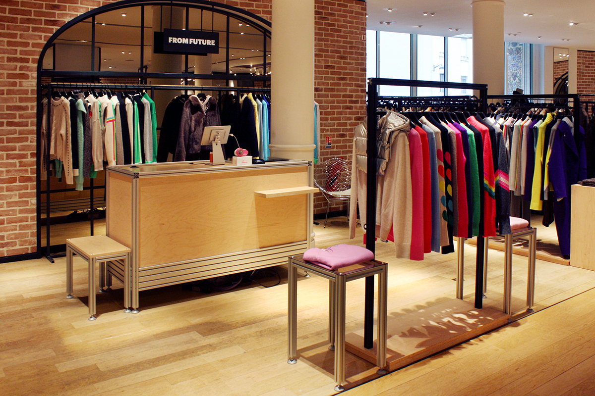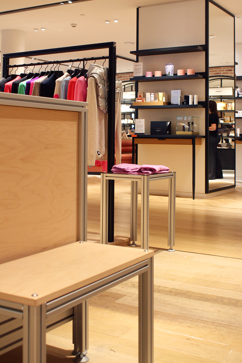 Le studio créatif Linie Studio est en charge du dessin des espaces de vente la marque de prêt à porter From Future. Les profilés en aluminium du fabricant Item sont employés pour créer l’identité de marque. Nous avons assemblé les structures et intégré les habillages et équipements en CP érable et verre. La simplicité apparente ne trahit pas la complexité du système et les multiples combinaisons possibles.