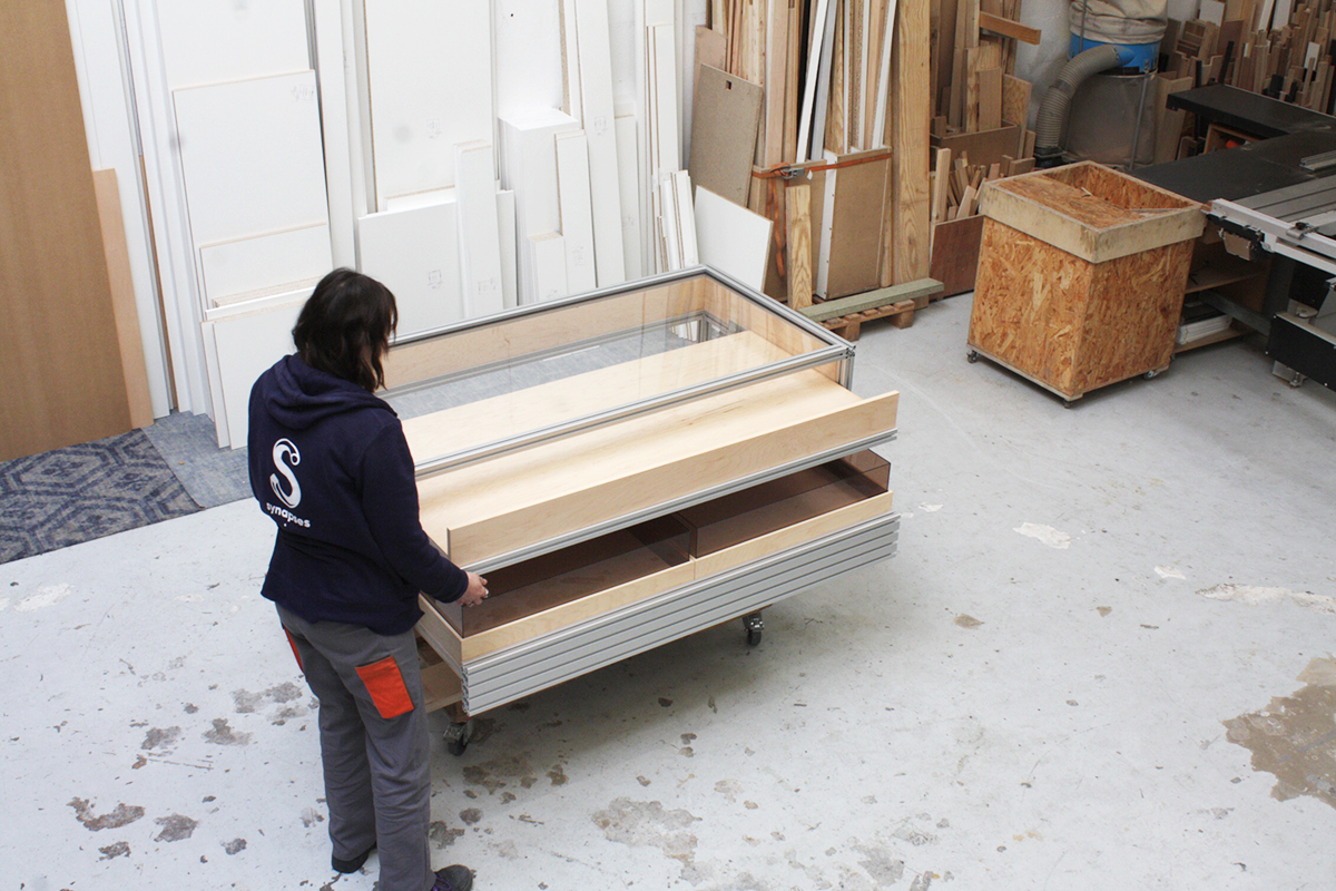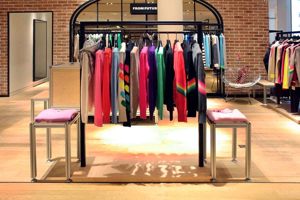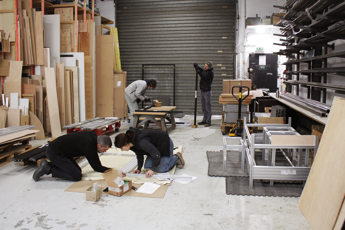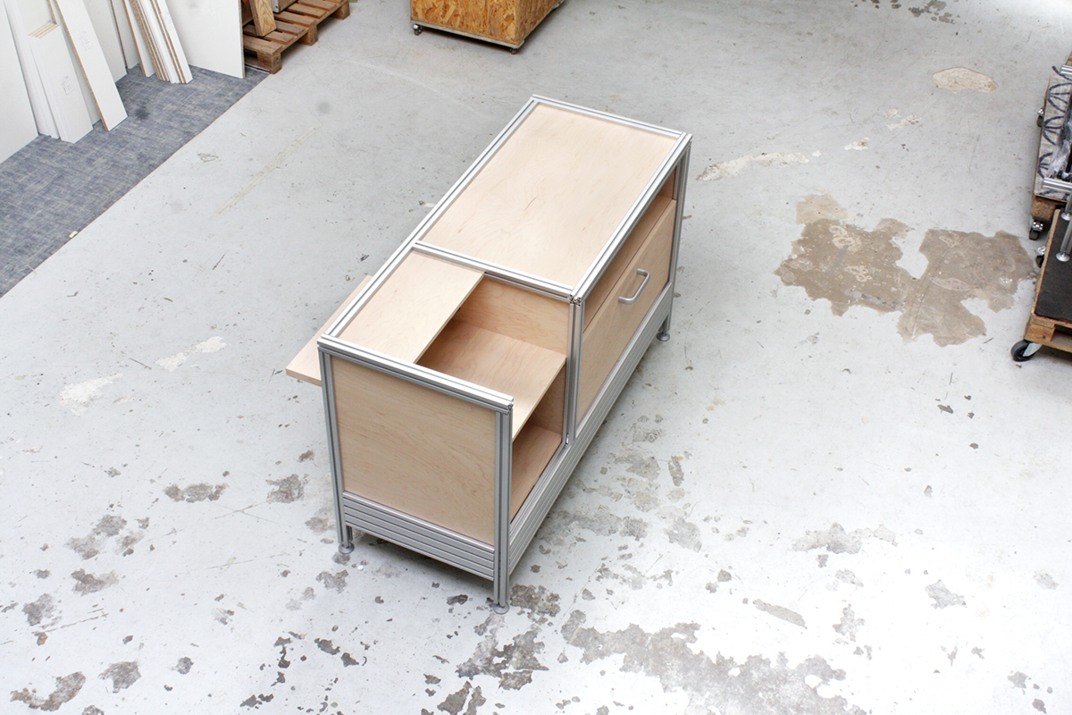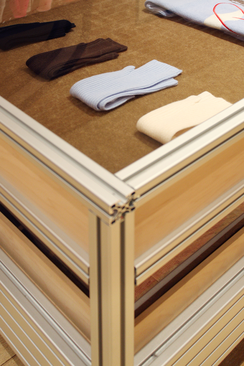 Le studio créatif Linie Studio est en charge du dessin des espaces de vente la marque de prêt à porter From Future. Les profilés en aluminium du fabricant Item sont employés pour créer l’identité de marque. Nous avons assemblé les structures et intégré les habillages et équipements en CP érable et verre. La simplicité apparente ne trahit pas la complexité du système et les multiples combinaisons possibles.