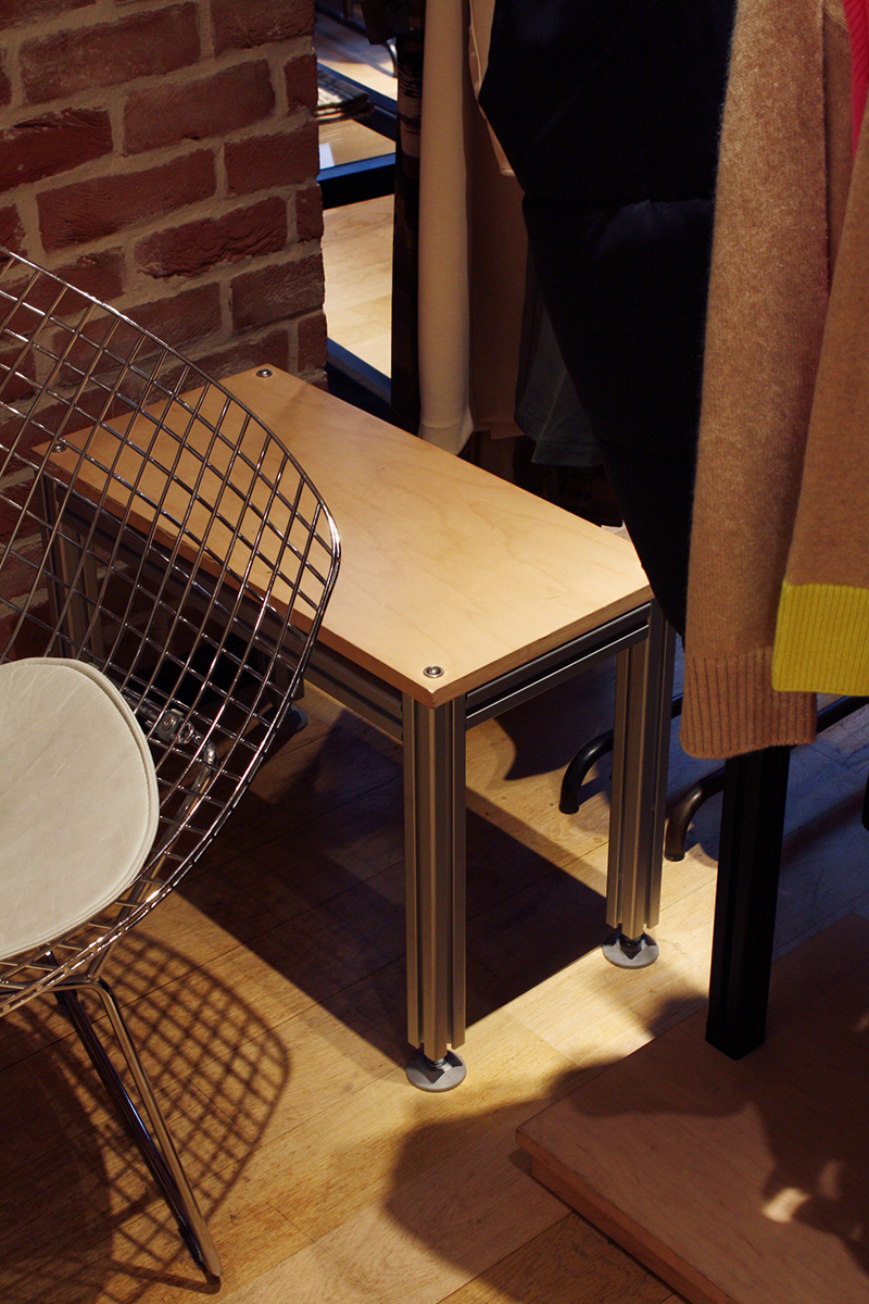 Banc en aluminium et érable dans la cabine d'essayage
