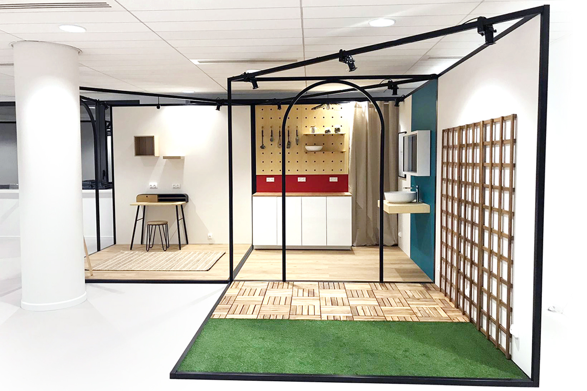 Le studio Correspondances design nous a confié la réalisation d’un ensemble de modules en métal et bois reconstituant les différentes pièces d’une maison afin de préparer et envisager l’expérience client ; ainsi qu’un espace de coworking et d’un ensemble de bureaux.