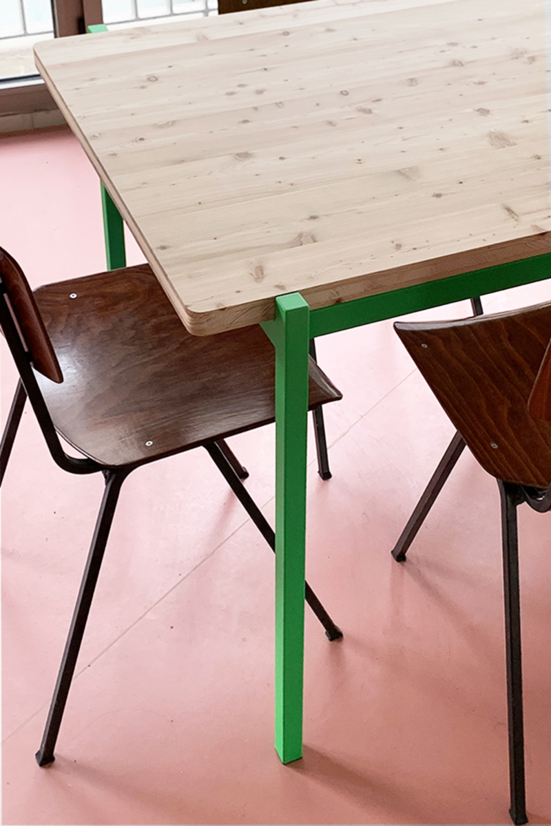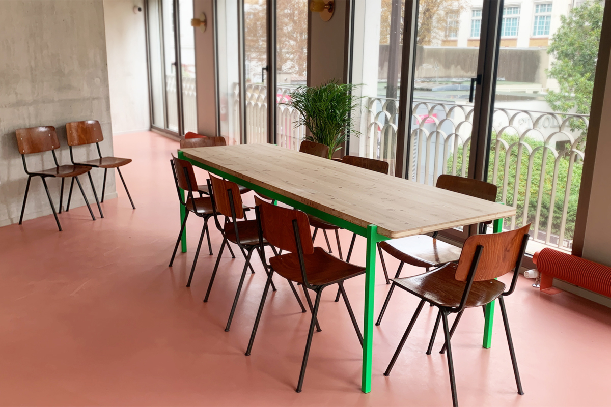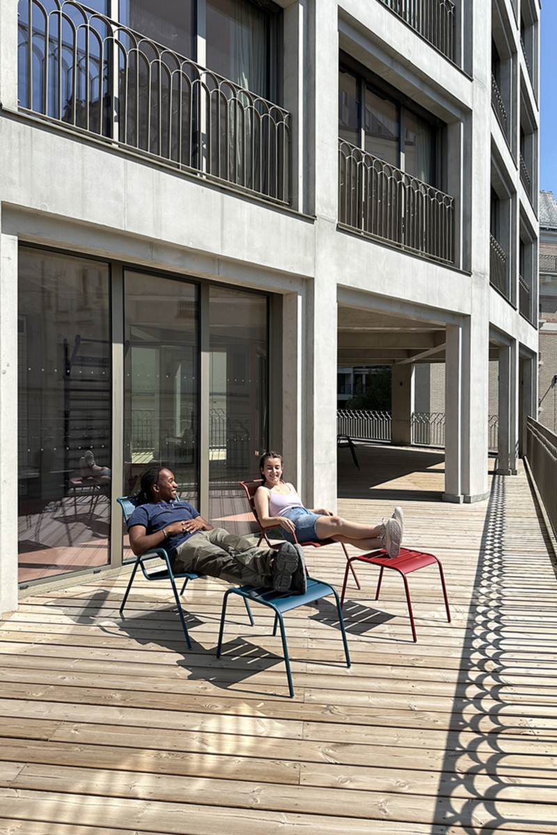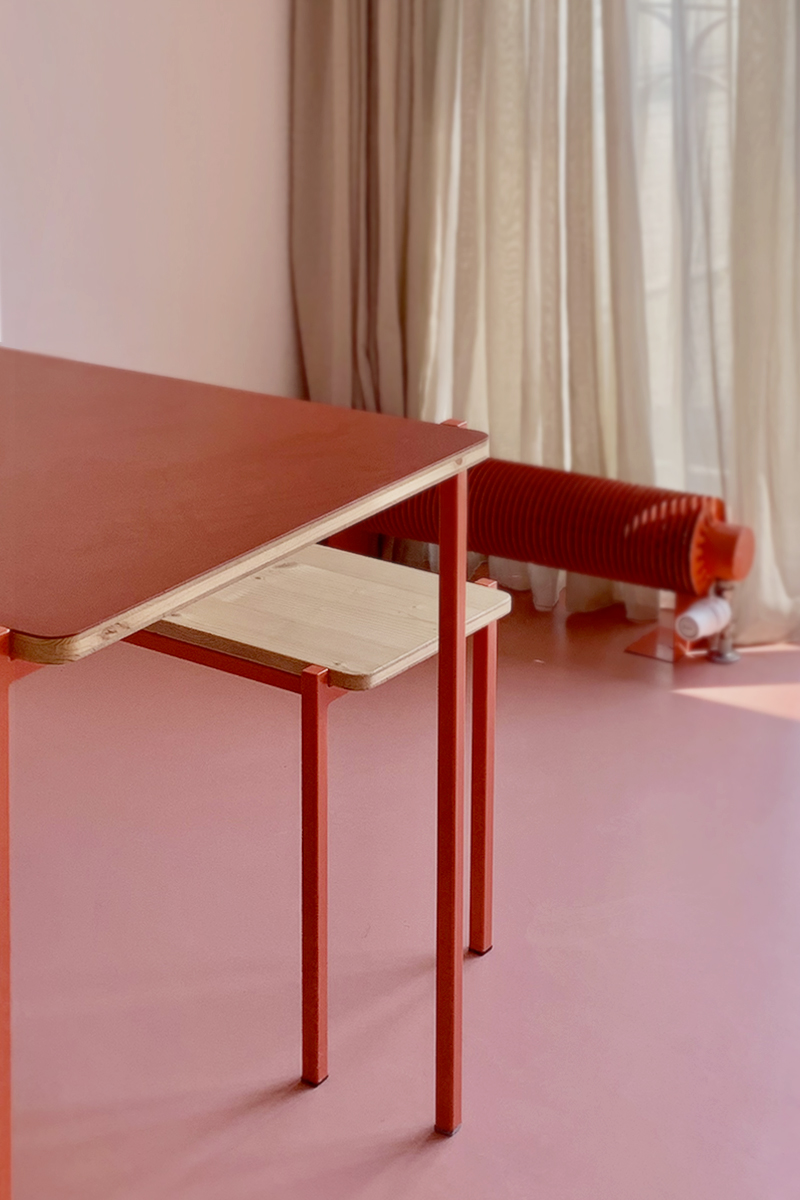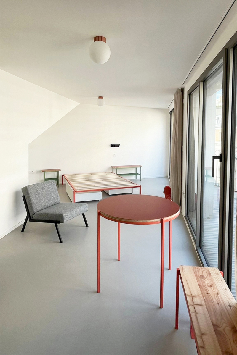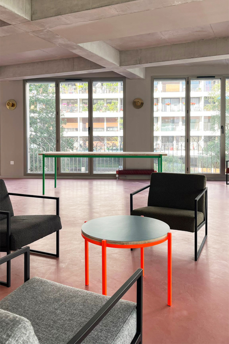 Le cabinet d’architecture Avenier Cornejo a conçu un ensemble de mobilier aux lignes minimales, en jouant sur les couleurs et les matériaux : tubes en acier, caillebotis, plateau en mélèze, revêtements en caoutchouc.