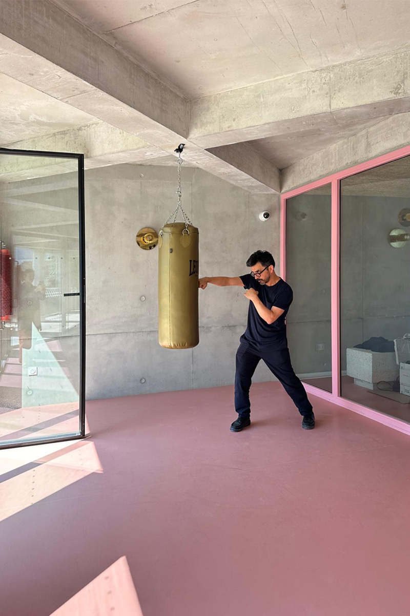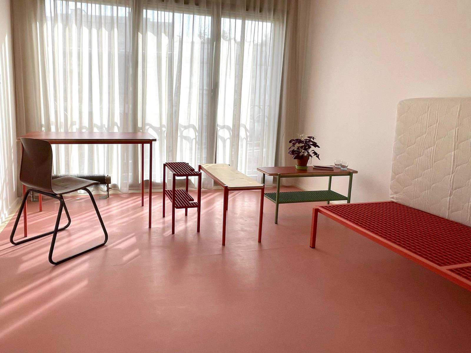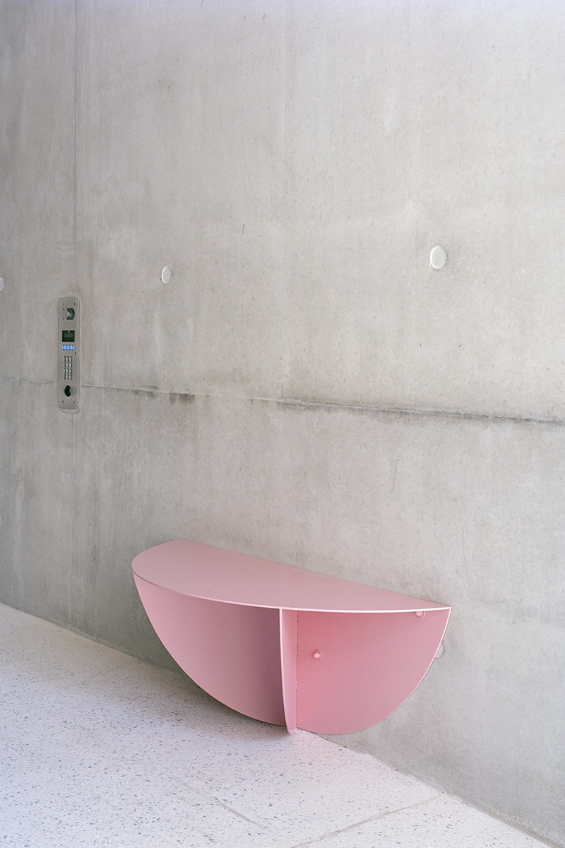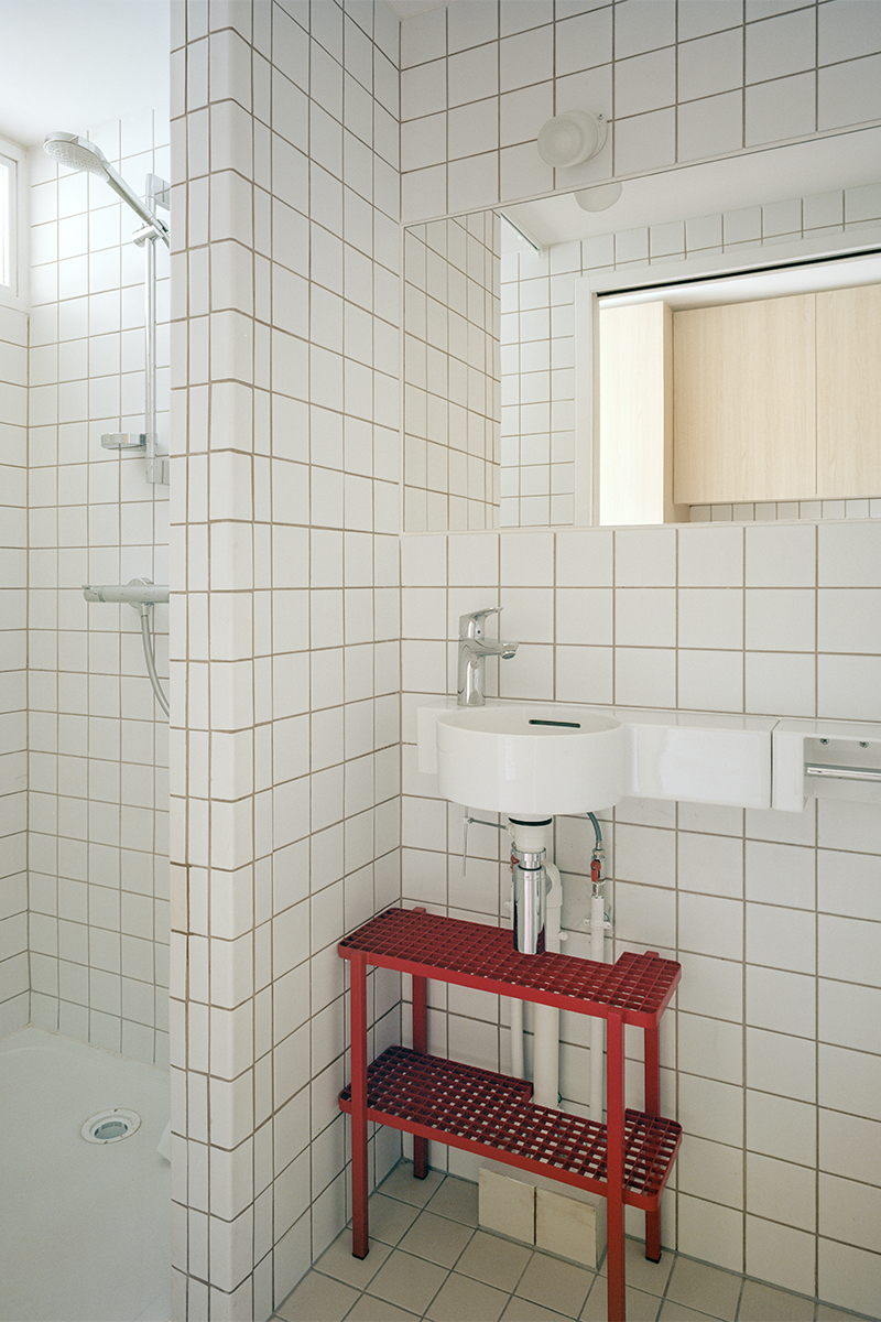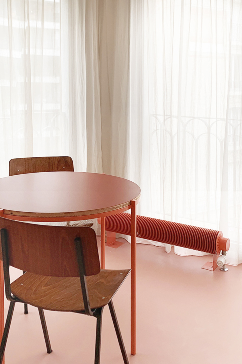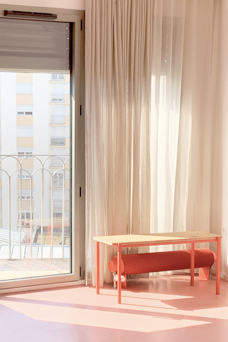 Le cabinet d’architecture Avenier Cornejo a conçu un ensemble de mobilier aux lignes minimales, en jouant sur les couleurs et les matériaux : tubes en acier, caillebotis, plateau en mélèze, revêtements en caoutchouc.