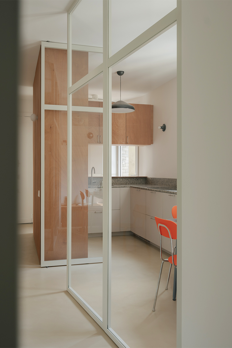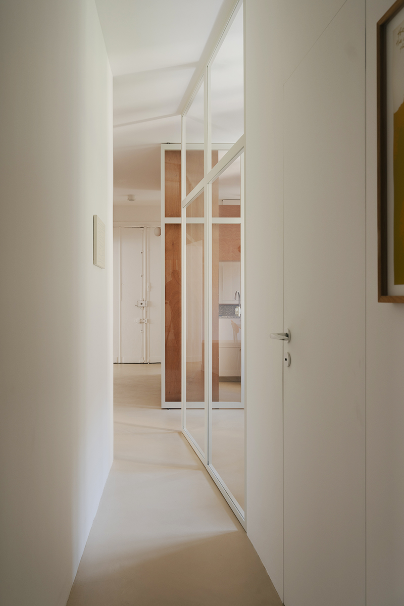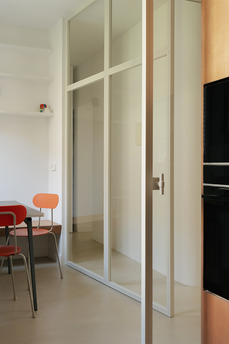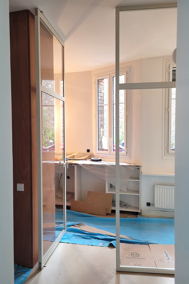 Pour la rénovation de cet appartement dans le 15ème, Caroline Weill de l’agence Pareil nous a demandé de fabriquer cette cloison vitrée, composée d’un grand châssis fixe et d’un ouvrant sur pivot. La petite cuisine bénéficie ainsi du volume du couloir qui la longe et la contourne