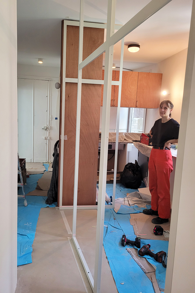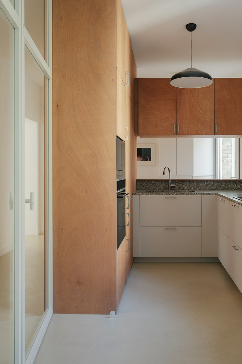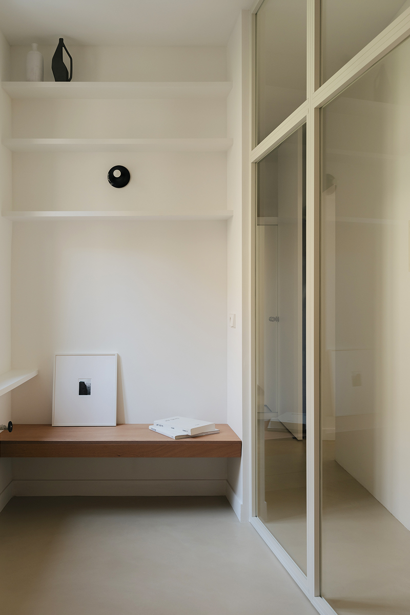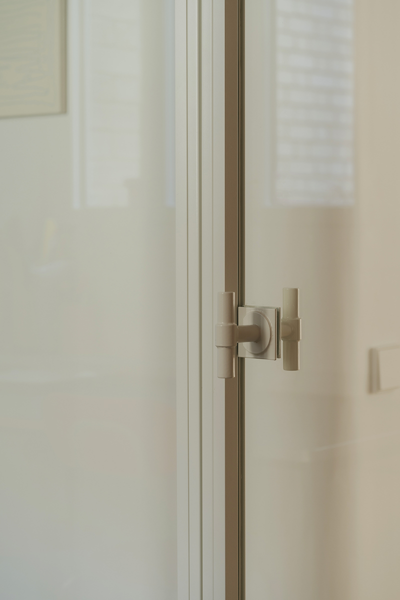 Pour la rénovation de cet appartement dans le 15ème, Caroline Weill de l’agence Pareil nous a demandé de fabriquer cette cloison vitrée, composée d’un grand châssis fixe et d’un ouvrant sur pivot. La petite cuisine bénéficie ainsi du volume du couloir qui la longe et la contourne